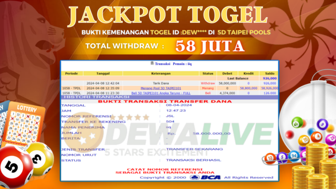 DEWALIVE JACKPOT TOGEL DI 5D TAIPEI POOLS Rp 58.000.000,- LUNAS